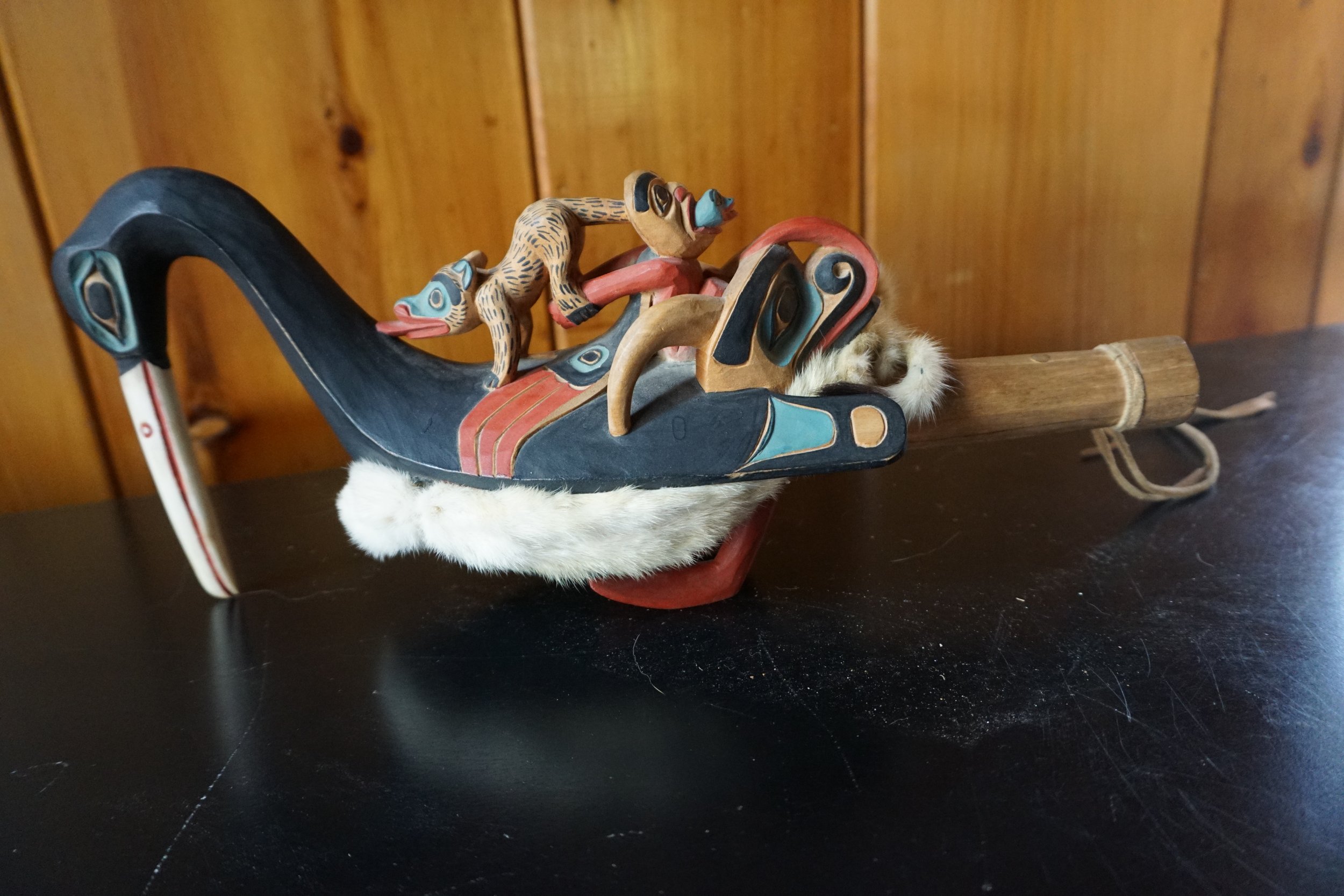 When adorned, as with ermine, it is a complex chief’s rattle. The chief while he is making a speech, shakes the rattle to emphasize what he is saying.