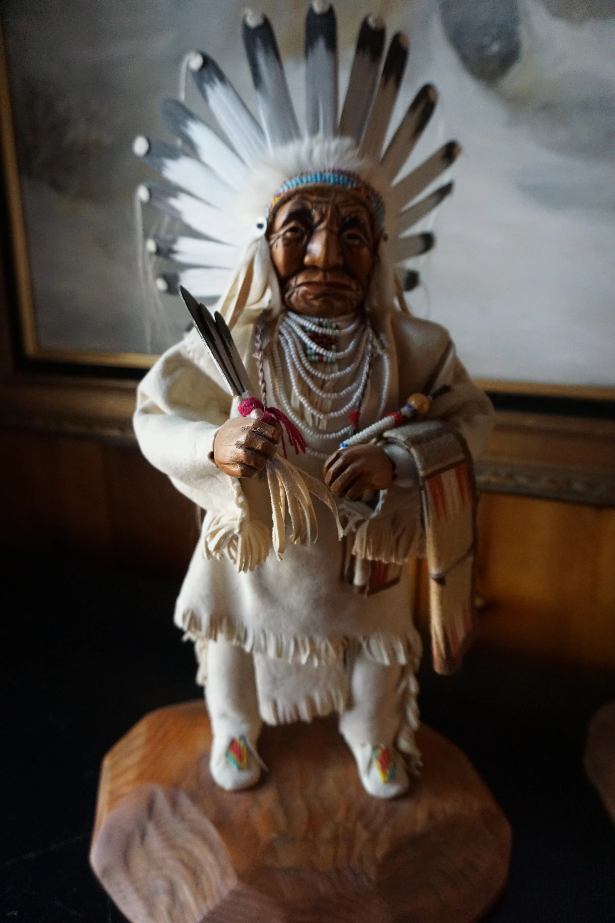 Standing 16” this Little Person tells the story of a proud nation and its Chief. Hand carved and dressed with authentic buckskin, it reflects a profound sense of culture and history.