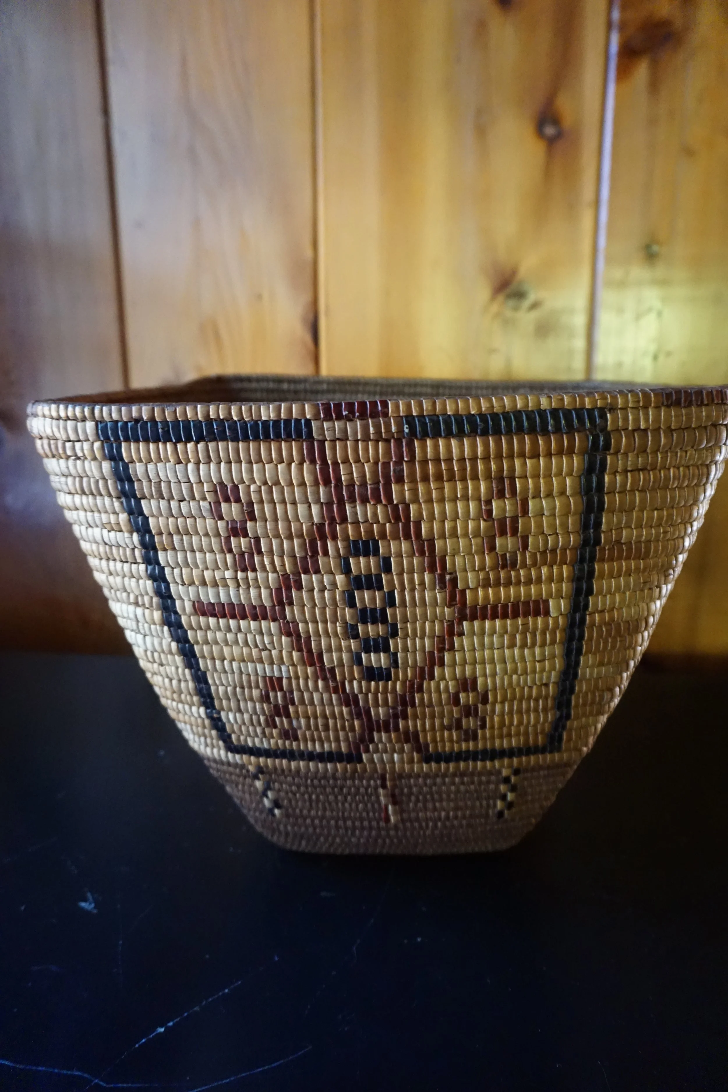 Truncated burden basket with large black and red geometric patterns on the outside. It is made of slats of cedar bark, sewn with cedar and imbracted with reed and cherry bark. Actually used for cooking and storage. Food was boiled by throwing hot stones into these water filled baskets. 10” x 12” x 10”