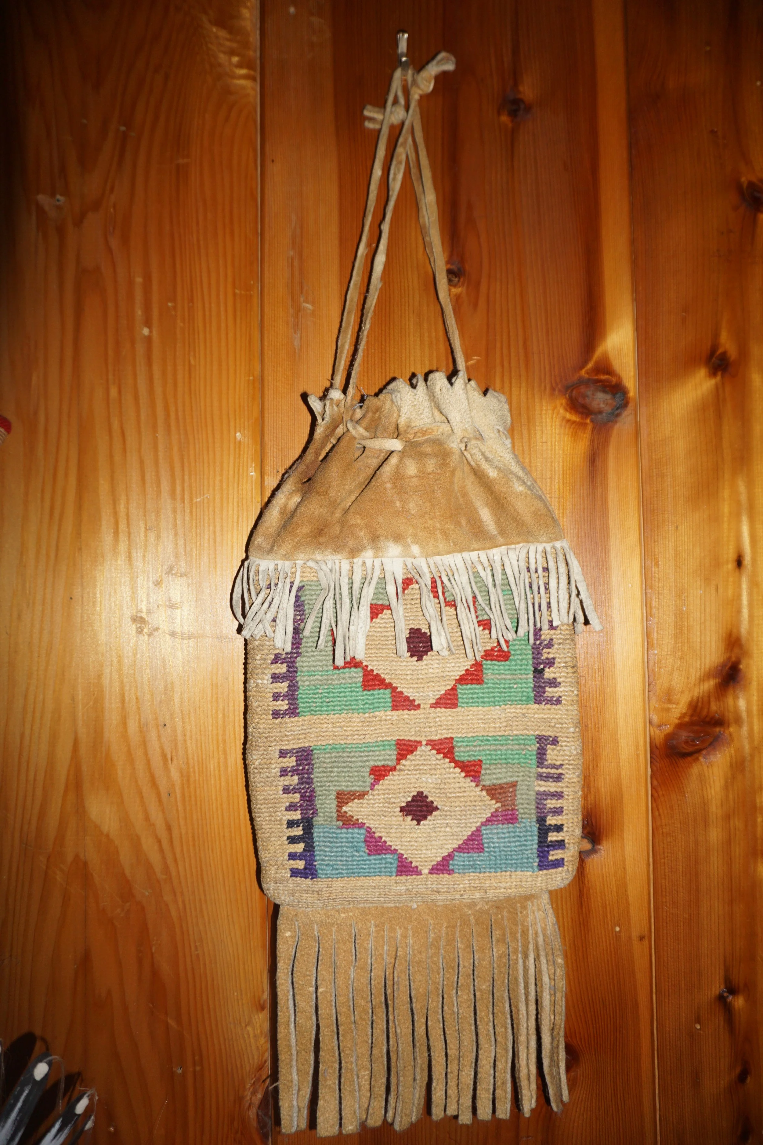 Women of the Plateau tribes-Nez Perce, Yakima, Walla Walla, Umatilla and Spokane - wove flat twined bags from hemp cord wrapped with husks.They added embricated colored geometric designs, and after 1920 curved flowers and animals. Originally used to store roots and foods for winter, these became women’s handbags, showing off their skills.